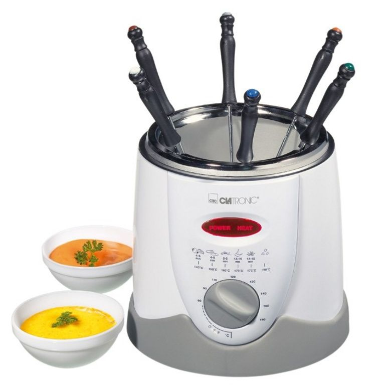 Korb mit abnehmbarem Griff, 6 Fonduegabeln (farbig) und Schutzring. Austauschbare Geruch und Fett. Stufenlos regelbarer Thermostat und Überhitzungsschutz. Inhalt: 1 l. Leistung: 900 W.