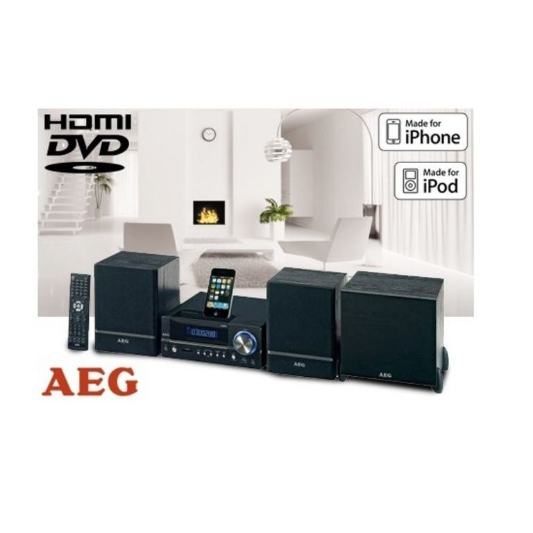 AEG DVD 4626 iP - 2,1 Musik mit DVD und HDMI (1080p), 2 x Stereo-Lautsprecher, externen Subwoofer, USB-Anschluss, Kartenleser, iPhone / iPod * Dock, LED-Display, Antenne, Fernbedienung, abnehmbare Lautsprechergitter, Netzschalter und AUX-IN.