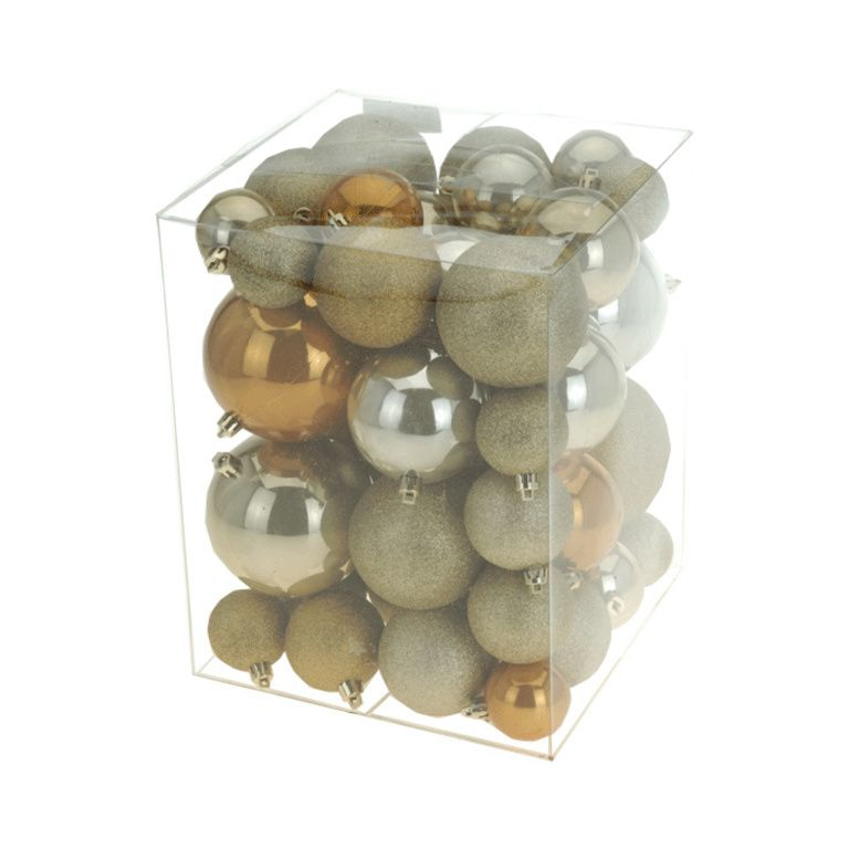 Schmücken Sie Ihren Baum in diesem Jahr mit Gold und braune Kugeln. Die Farben dieses Jahres. Mit diesem Paket erhalten Sie sofort verschiedene Typen und Größen Kugeln zu Hause.