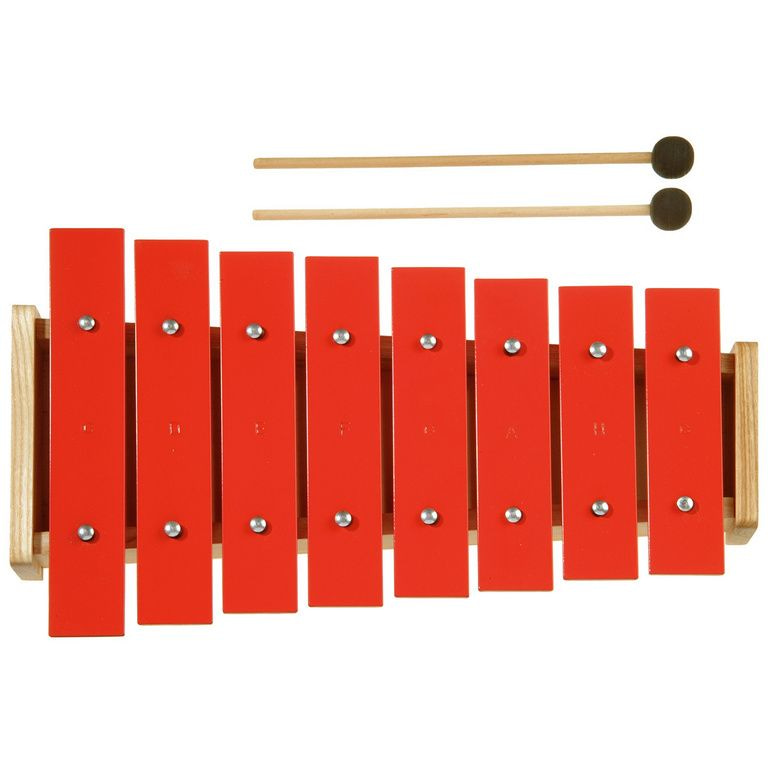 Mit Stöcken in den Händen, der kleine Musiker seine eigene Musik. Das Metallophon hat einen Holzrahmen und farbige Klangplatten.