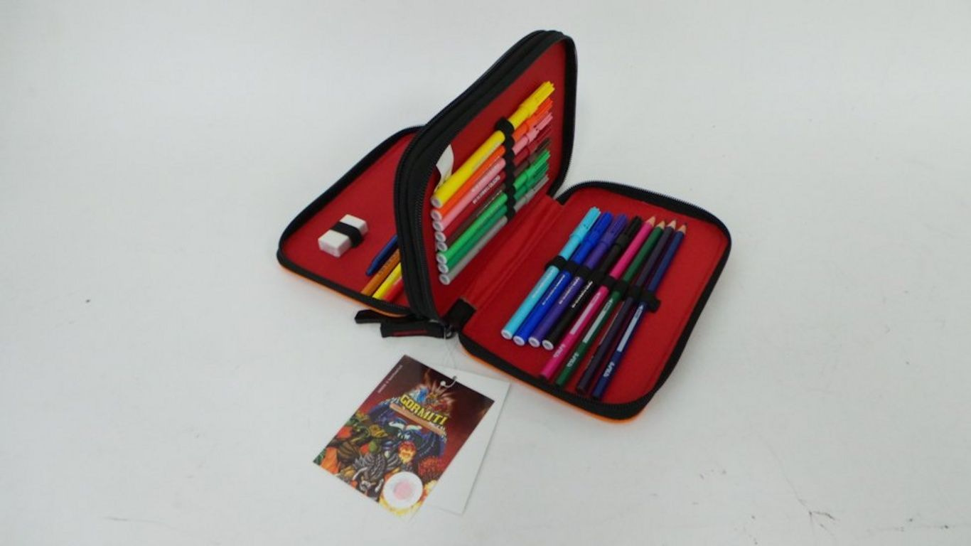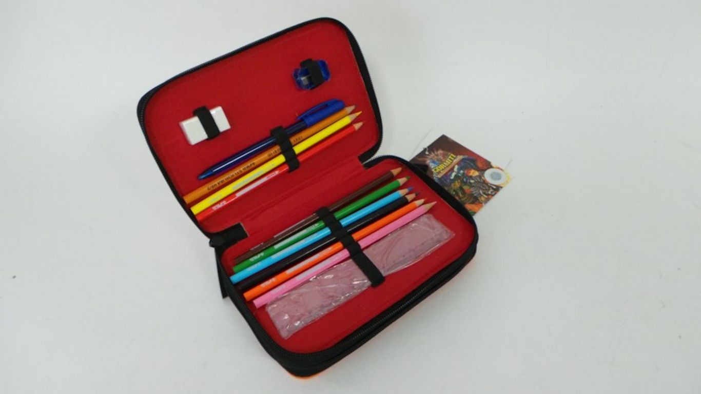 Inhalte sind Malstifte, Bleistifte, Radiergummi, Lineal, etc. pountenslijper