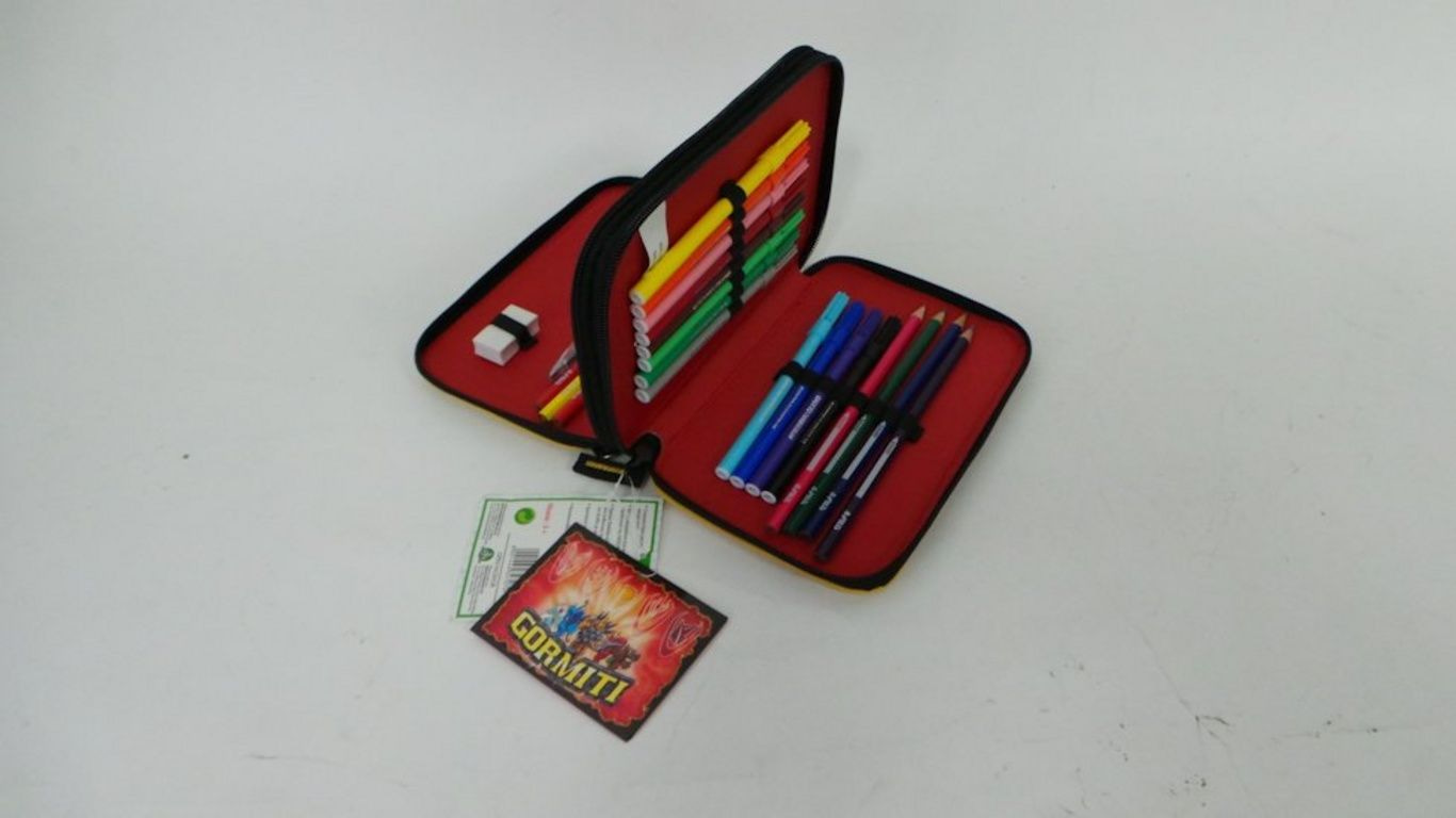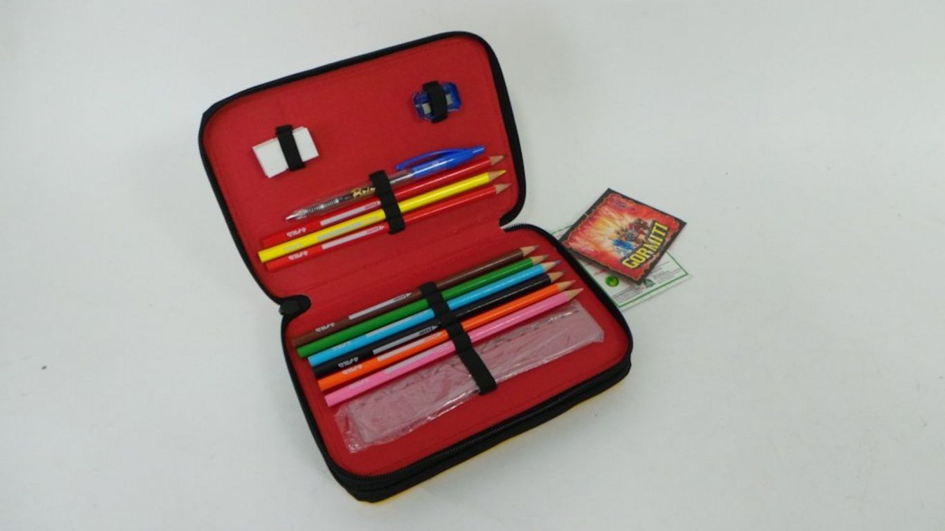 Inhalte sind Malstifte, Bleistifte, Radiergummi, Lineal, etc. pountenslijper
