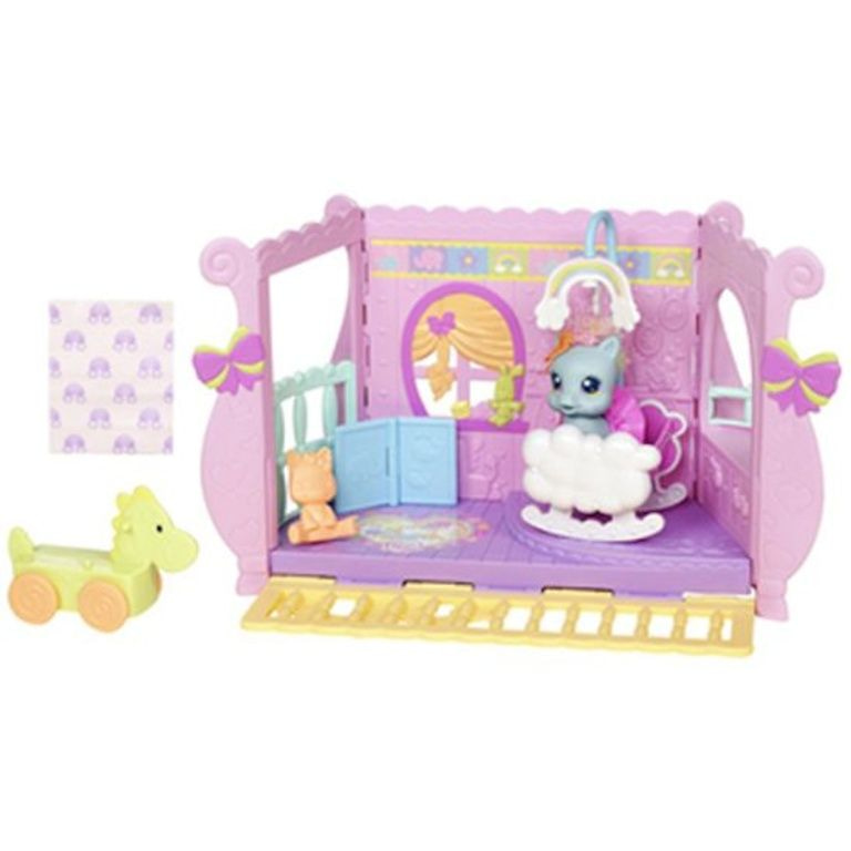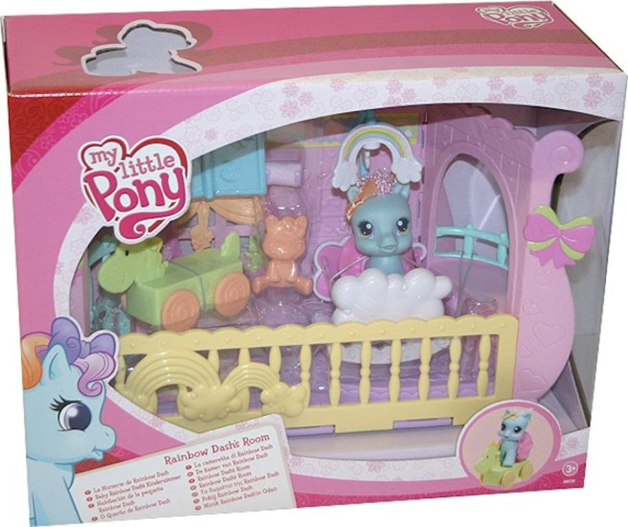 Pflege für den kleinen Baby-Pony Rainbow Dash. Sie liebt es, in ihr Zimmer zu spielen, dann werde gut schlafen in ihrem Bettchen. Ab 3 Jahren.