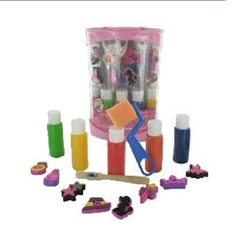 Verfen en stempelen met deze mooie set, bestaande uit: 5 kleuren verf, 8 stempels, rollers en kwast. Verpakt in een mooie box.