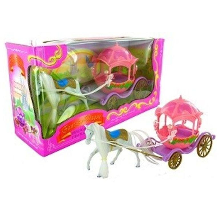Schönes großes Pferd mit Kutschenspielset. Abmessungen: 33 x 10 x 17 cm.