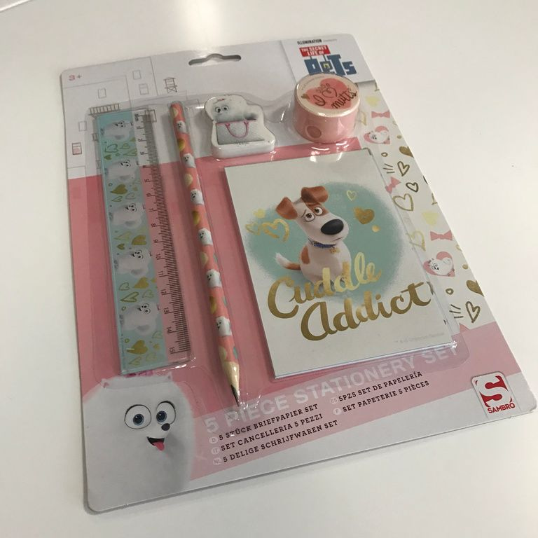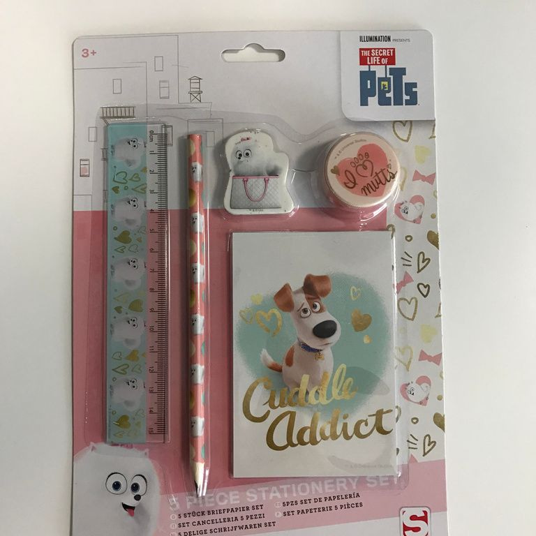 Lineal, Bleistift, Radiergummi, Spitzer und Notebook.