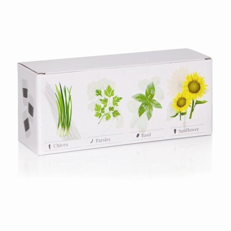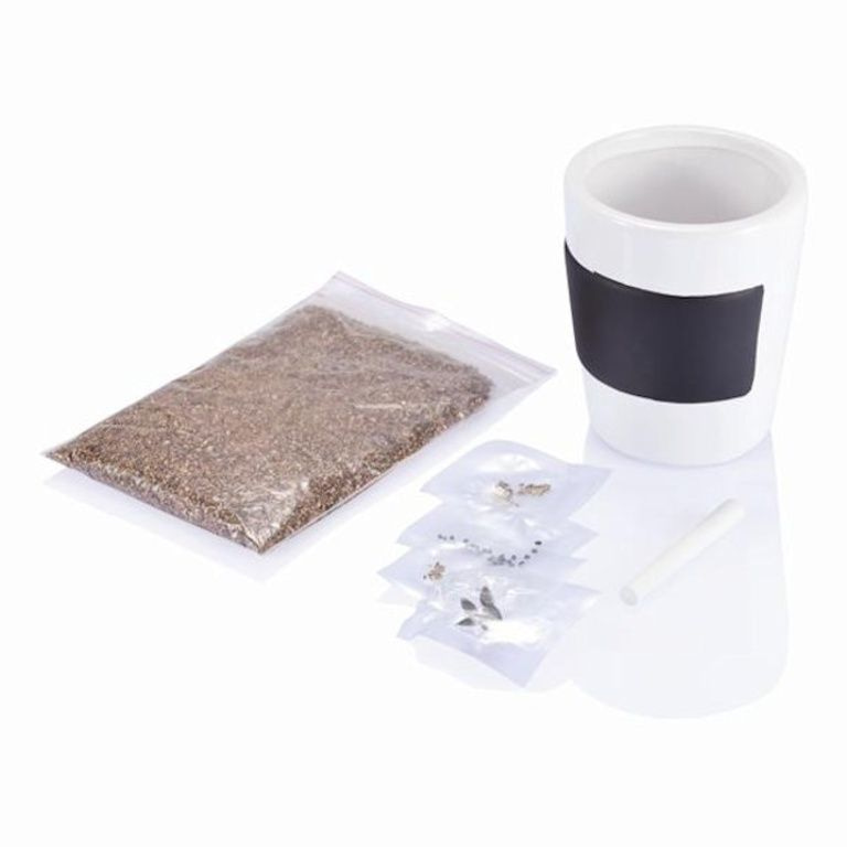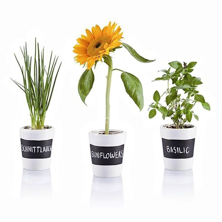 Set von 3 Keramik Kräutertöpfe mit Tafel Oberfläche. Inklusive Kreide, Erde und Saatgut für Petersilie, Schnittlauch, Basilikum und Sonnenblumenkerne.