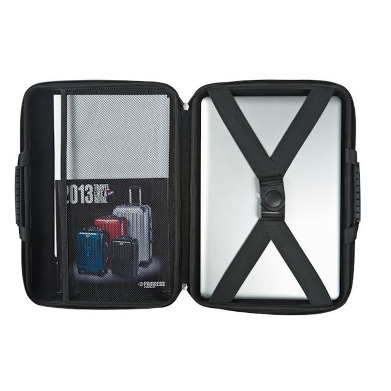 Die Abdeckung weist auf der Innenseite über eine verschließbare Schnalle, um das Notebook in Position zu halten.