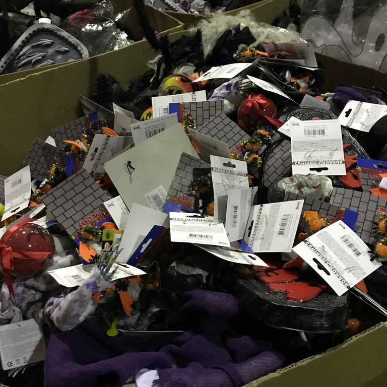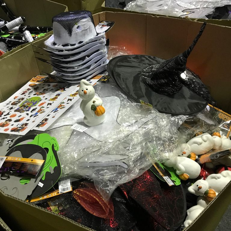 9x Palletboxen with mix Halloween items. Pallet size: 120 x 80 x 100 Cm.