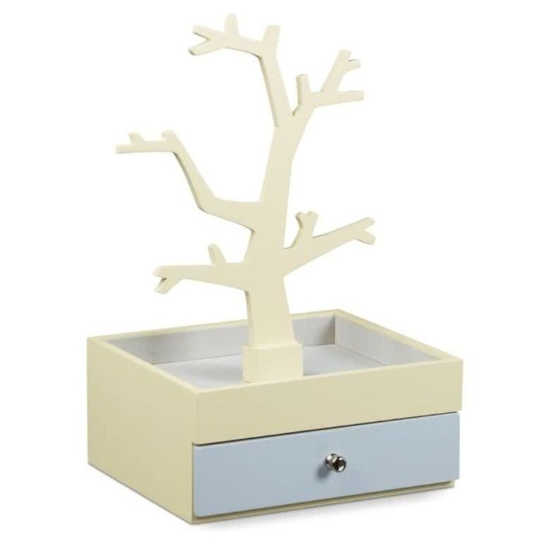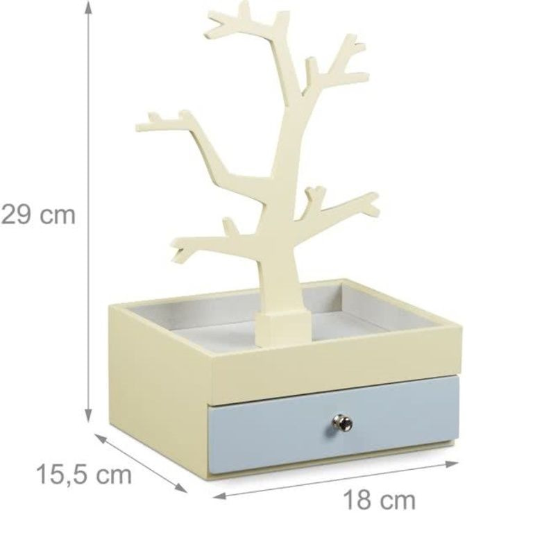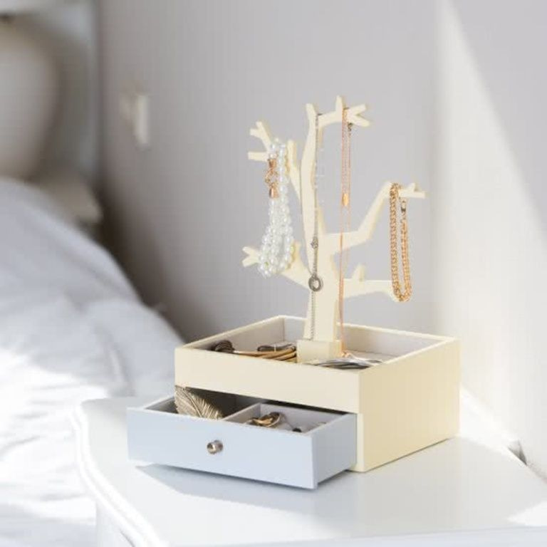 - In beige-gelber und grauer Schmuckschatulle mit Schublade und Schmuck Baum