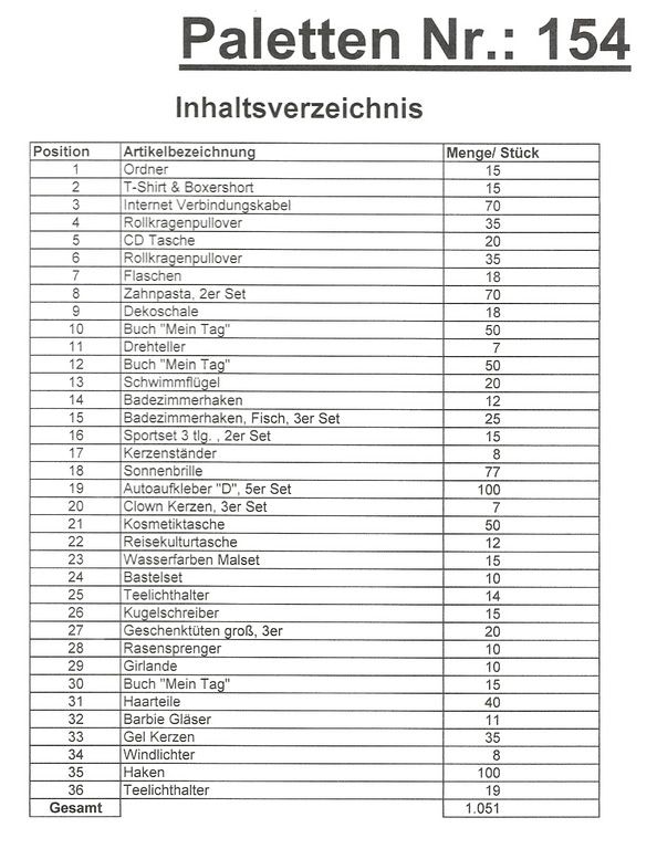Inhalt-Palette: 1. St. 051 verschiedene Artikel!